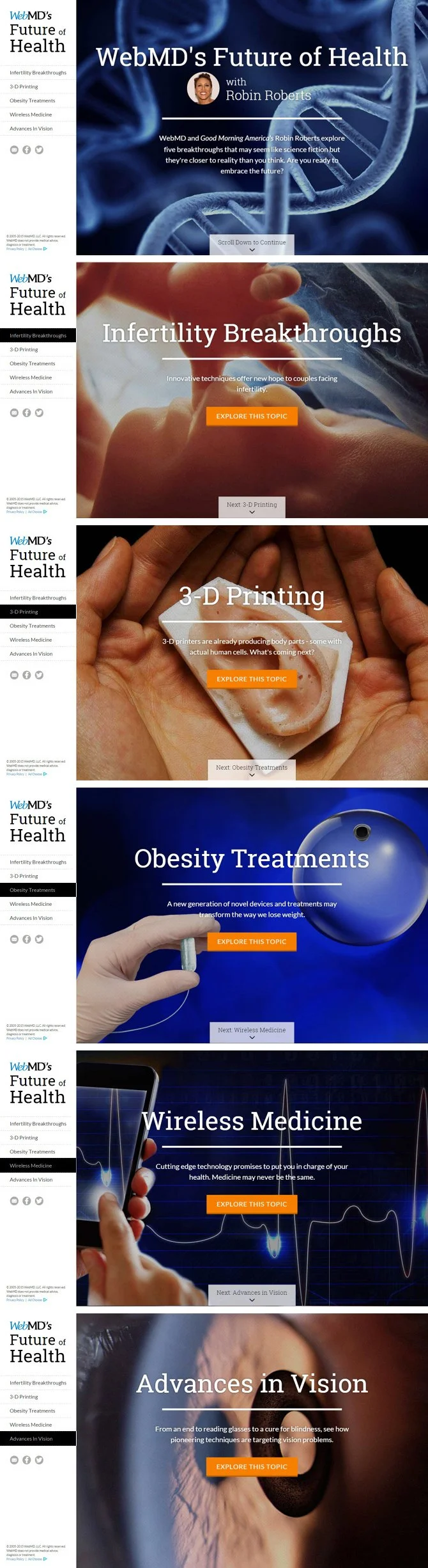 Future of Health is a WebMD partnership with Good Morning America’s Robin Roberts that spotlights cutting-edge innovation in an immersive experience featuring video, slideshows, articles and infographics. I worked with designers, web developers and writers at both WebMD and GMA to craft this destination.
